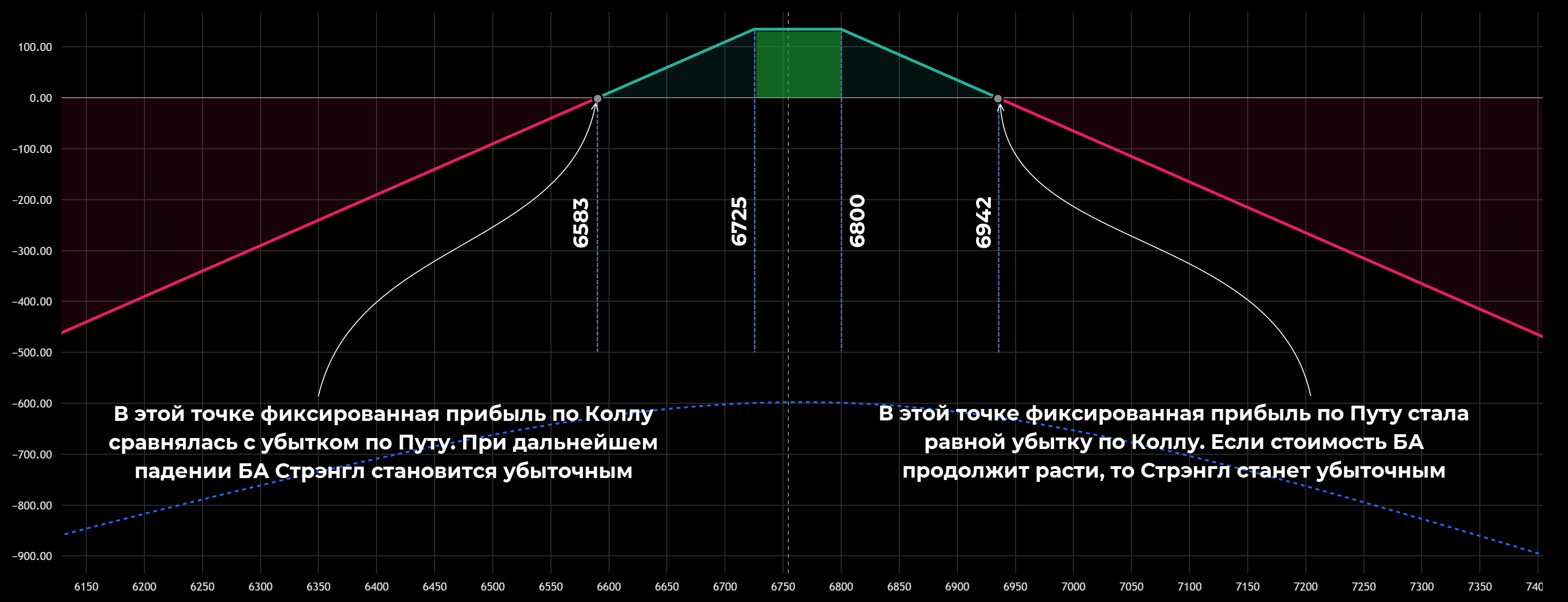 • Точки безубыточности рассчитываются с учетом премий и страйков. Нижняя точка 6725 – 142 = 6583, верхняя – 6800 + 142 = 6942.