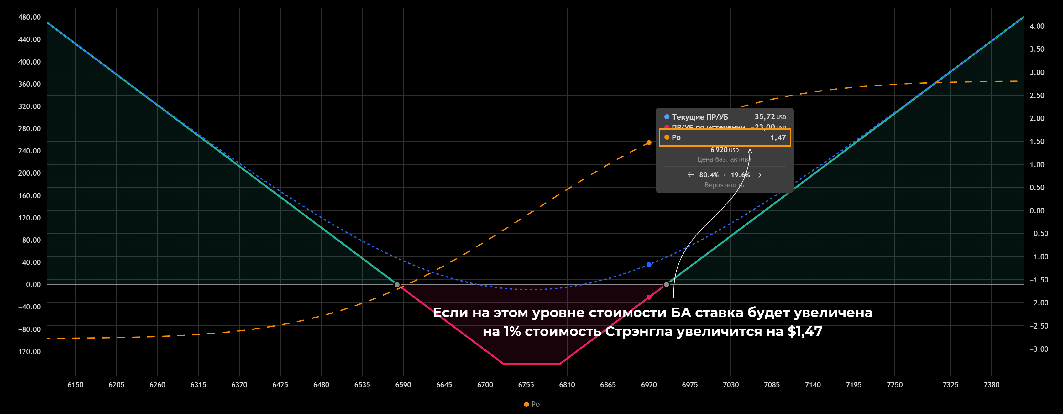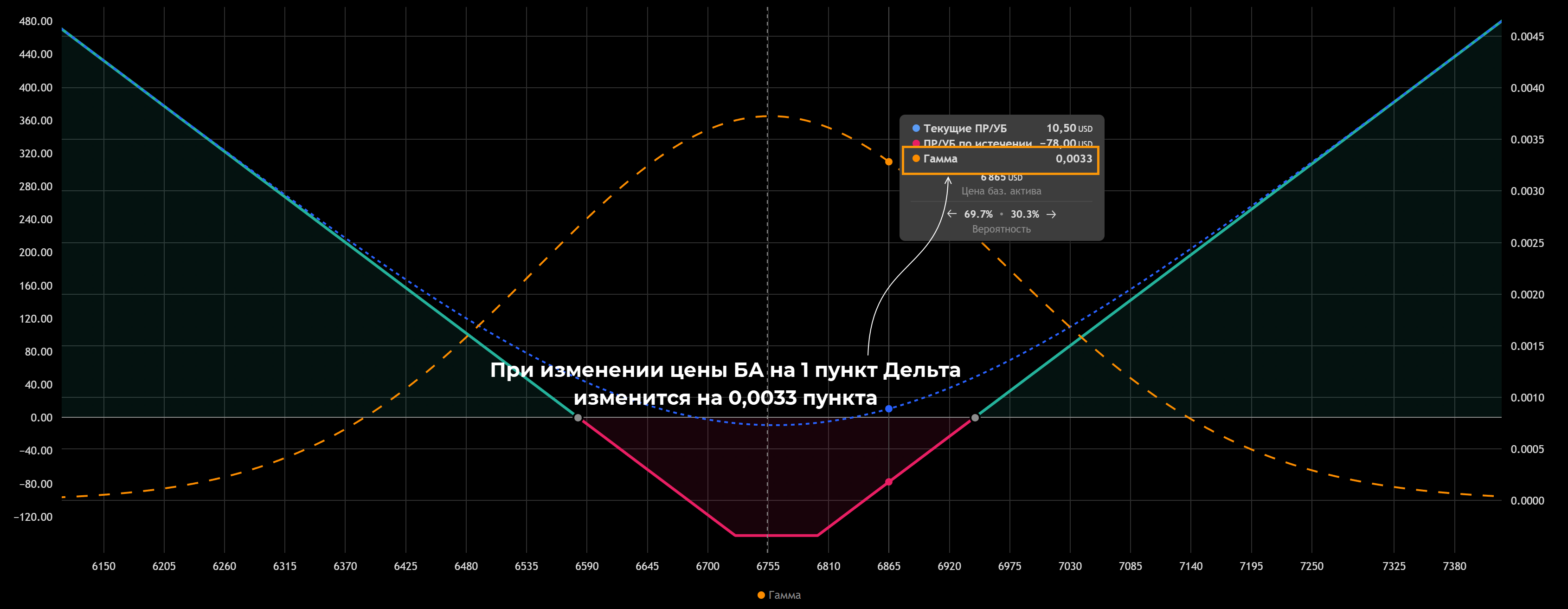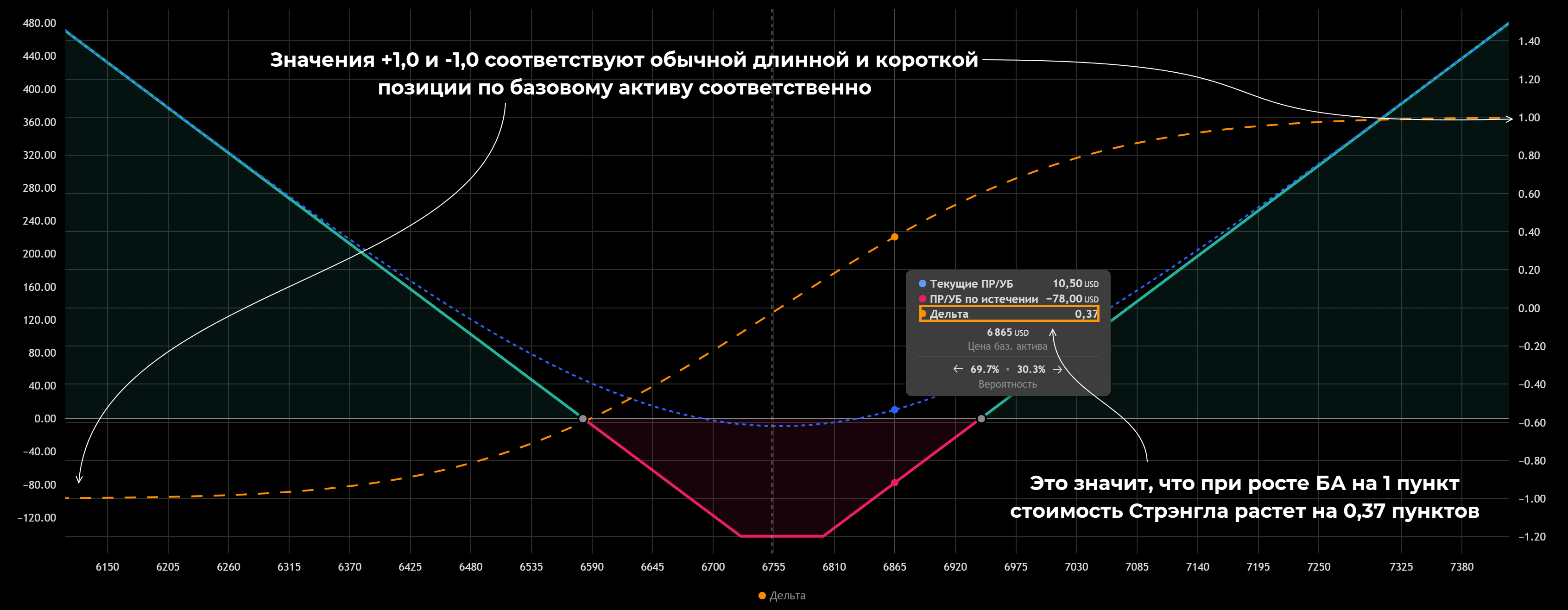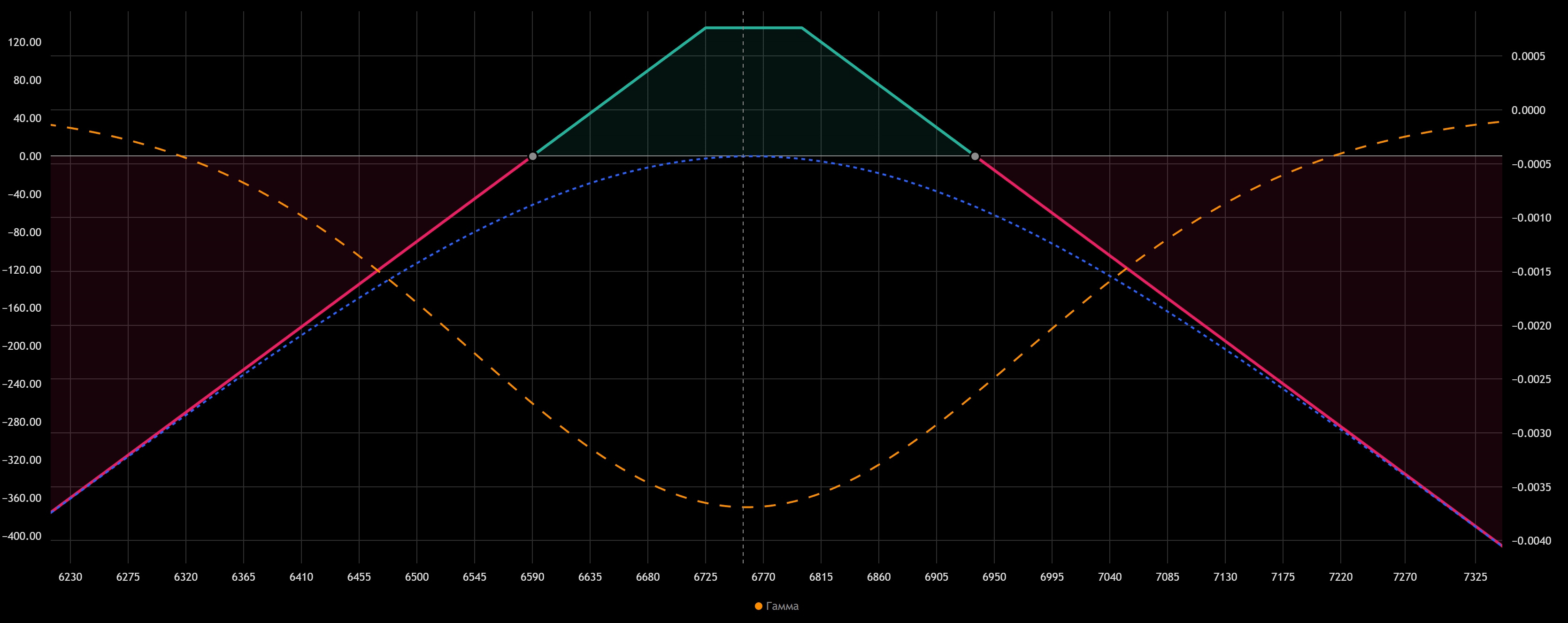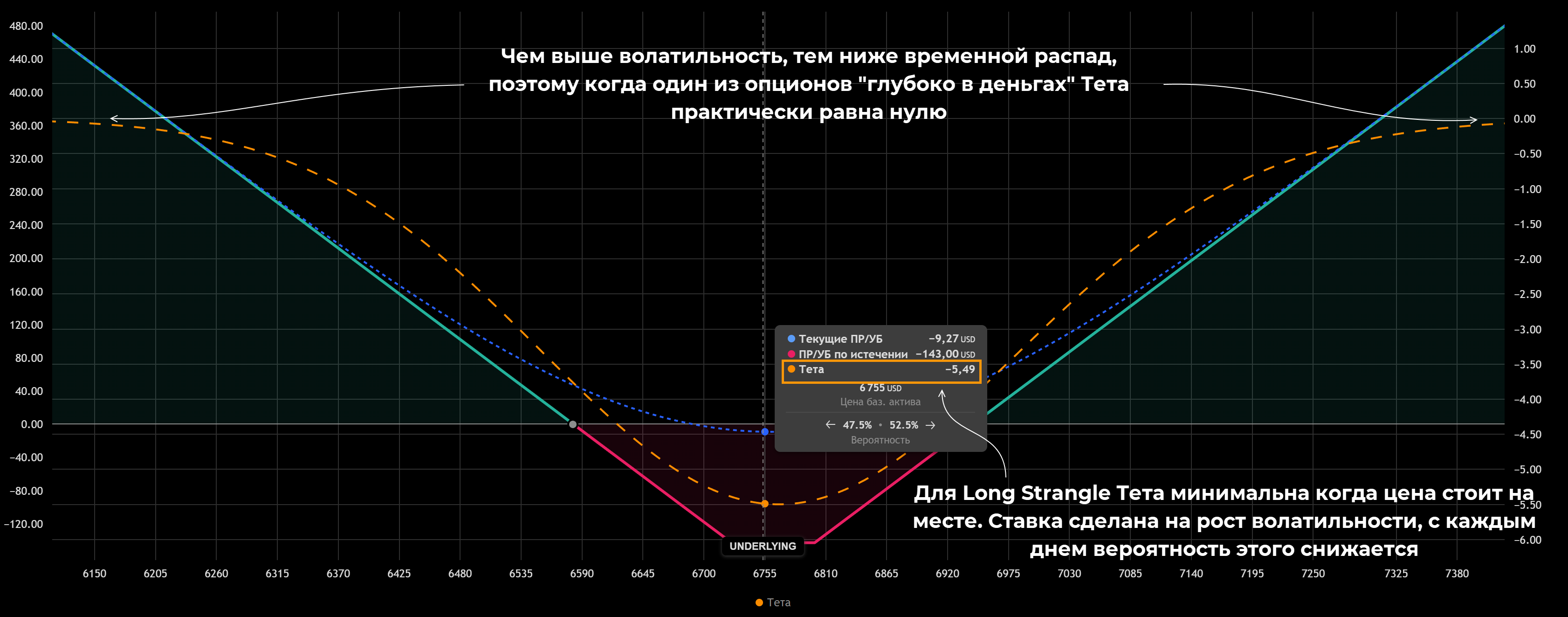 Для длинного Стрэнгла Тета будет минимальной для уровня стоимости БА, на котором покупались опционы. В этой стратегии ставка сделана на рост/падение актива, если он будет оставаться на месте, трейдер получит убыток. В примере Тета -$5,49 означает, что если цена БА будет оставаться на отметке 6755, то каждый день стоимость Стрэнгла будет снижаться на $5,49.