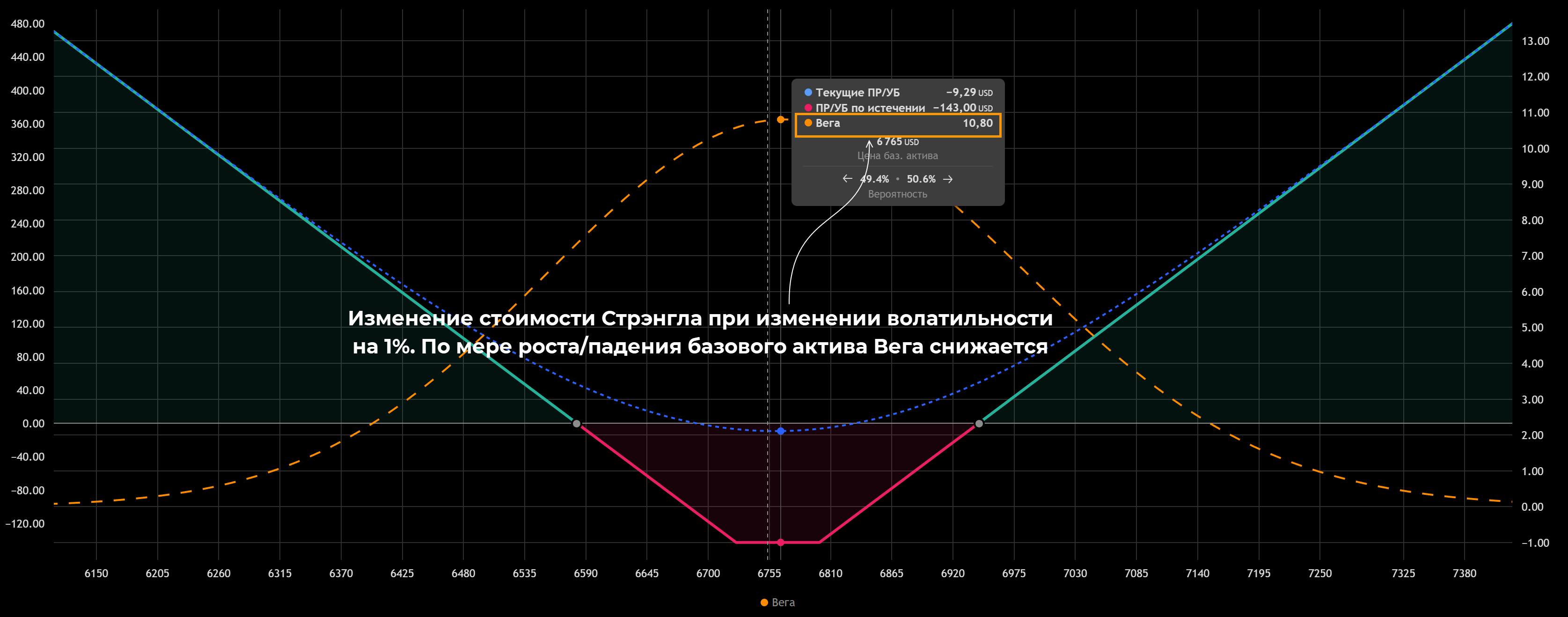 Вега дает количественную оценку этого фактора. Конкретное число грека можно трактовать как изменение стоимости Стрэнгла при изменении IV на 1%.