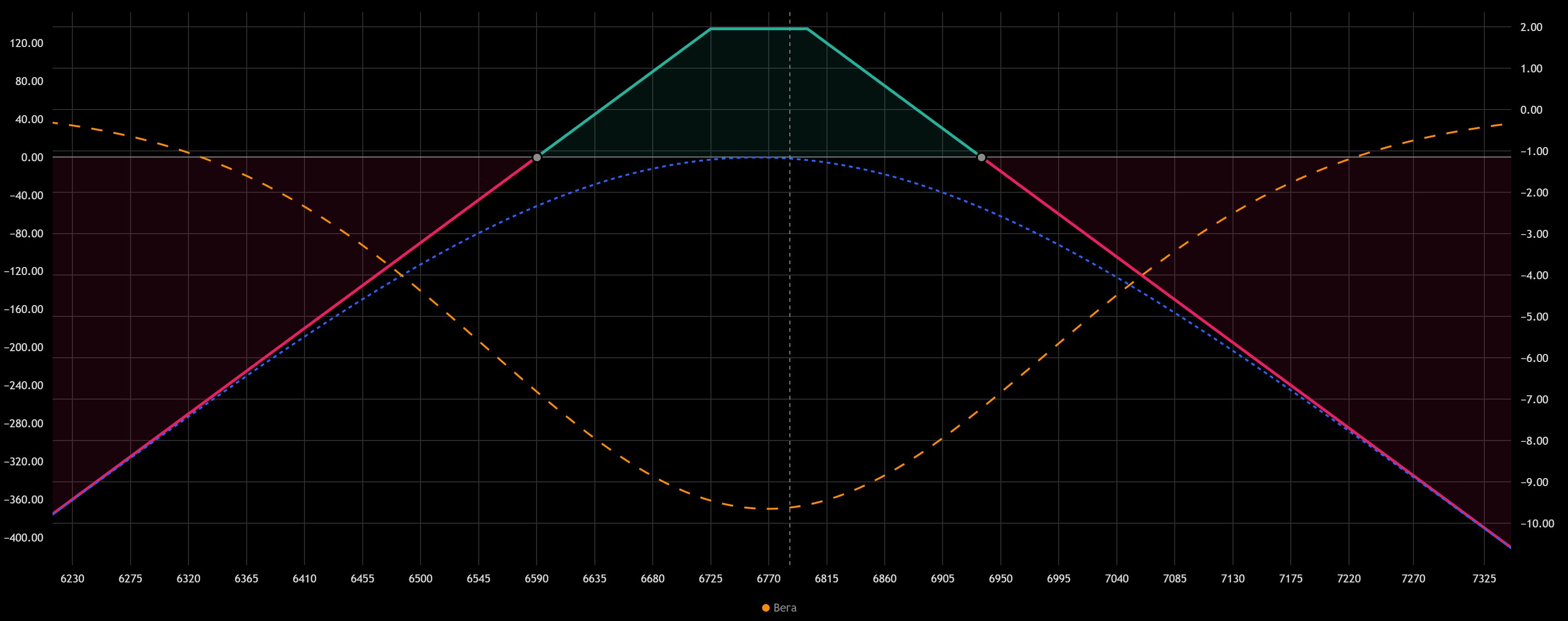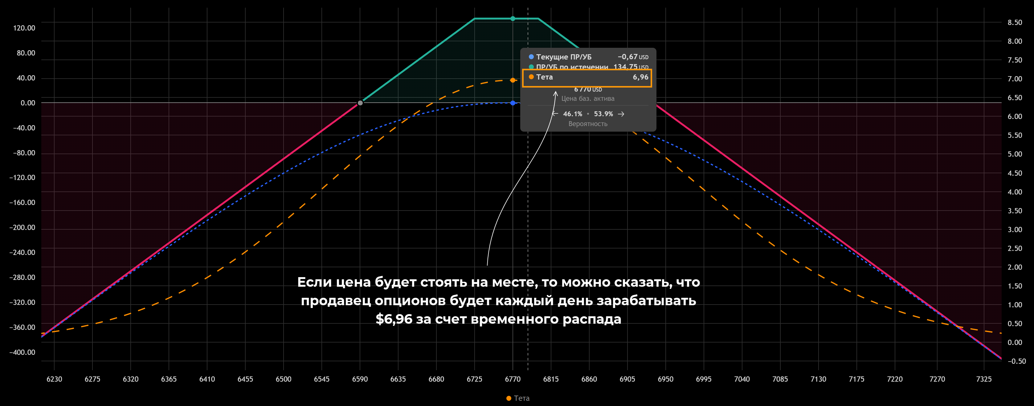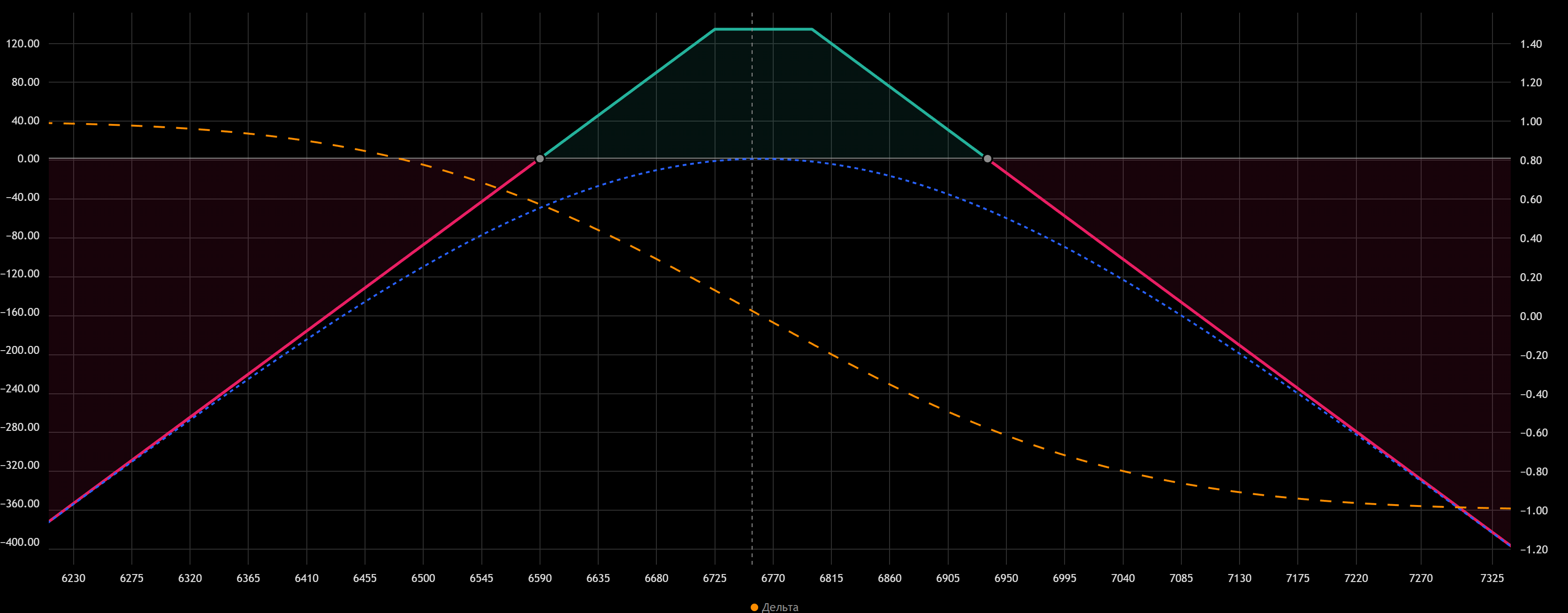 • Если цена останется в коридоре между 2 экспирациями (6725 — 6800), то продавец заработает $142.