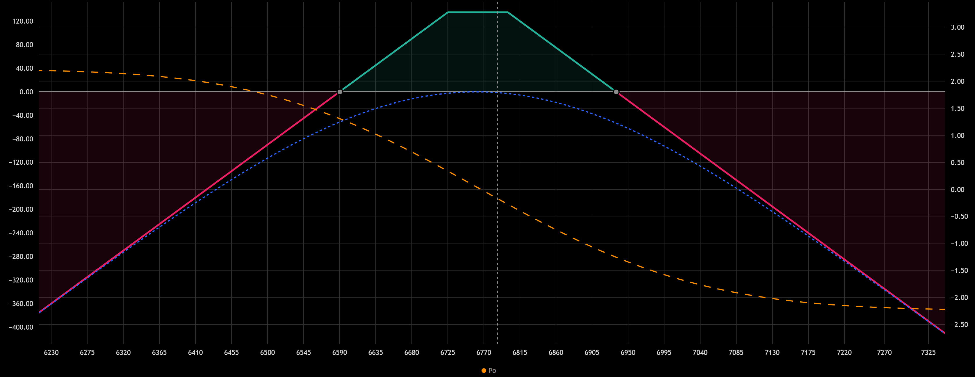 • Для определения точек безубыточности нужно добавить суммарную премию к страйку по Коллу и вычесть премию из страйка по Путу. Верхняя точка безубыточности 6800 + 134,75 = 6934,75, нижняя точка – 6725 – 134,75 = 6590,25.
