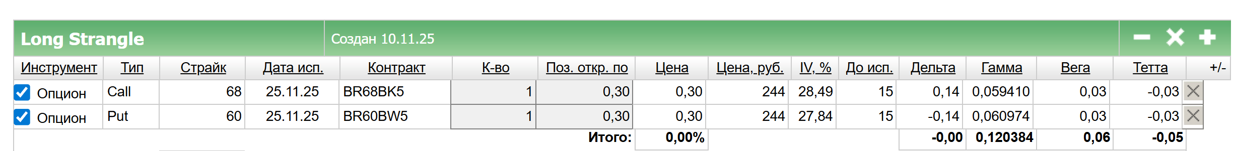 В примере собирался длинный Стрэнгл по нефти марки Brent, сделки заключались 10 ноября, экспирация – 25 ноября. Ставка сделана на рост волатильности.