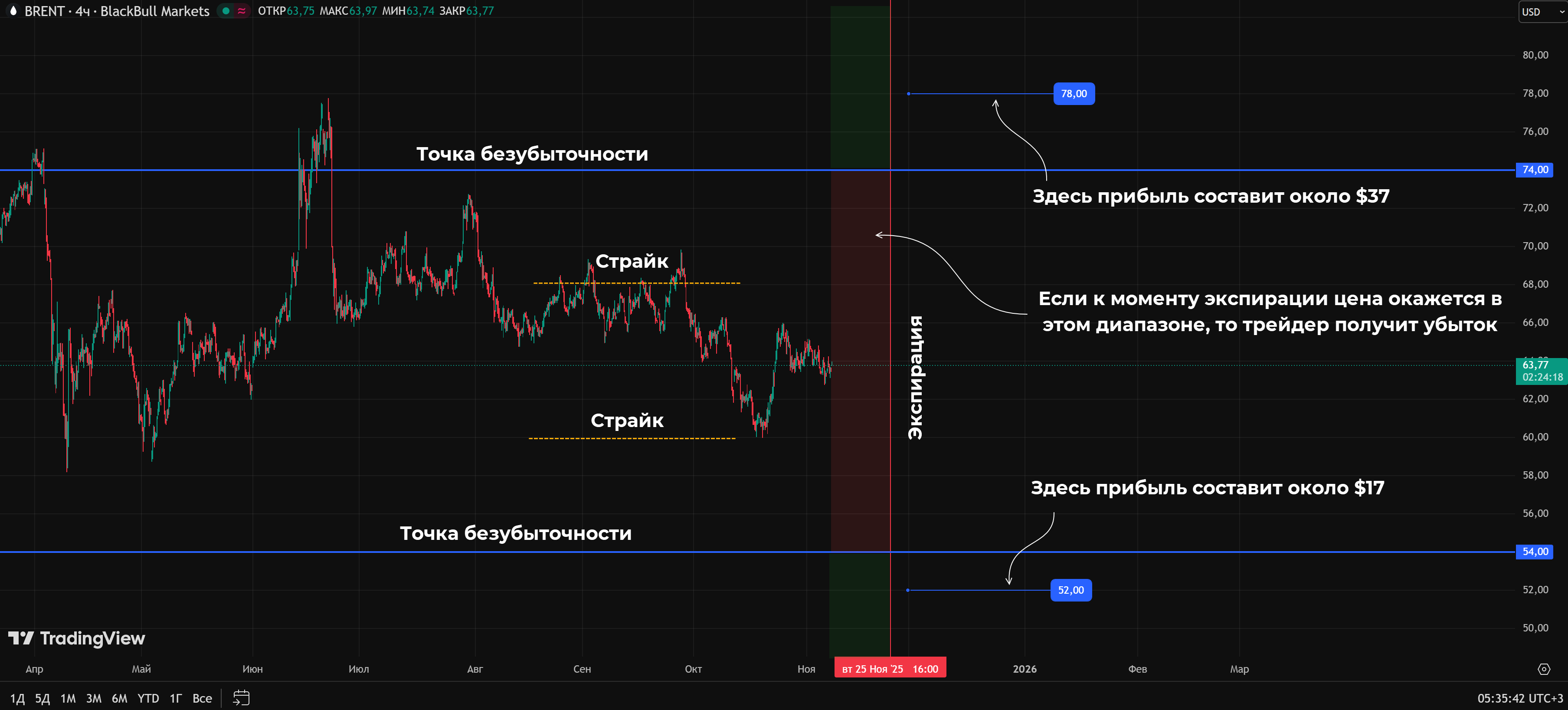 • С учетом этого точки безубыточности находятся на отметках 68 + 6 = $74 и 60 – 6 = $54. Для заработка стоимость нефти должна либо упасть ниже $54, либо вырасти до отметки $74+.