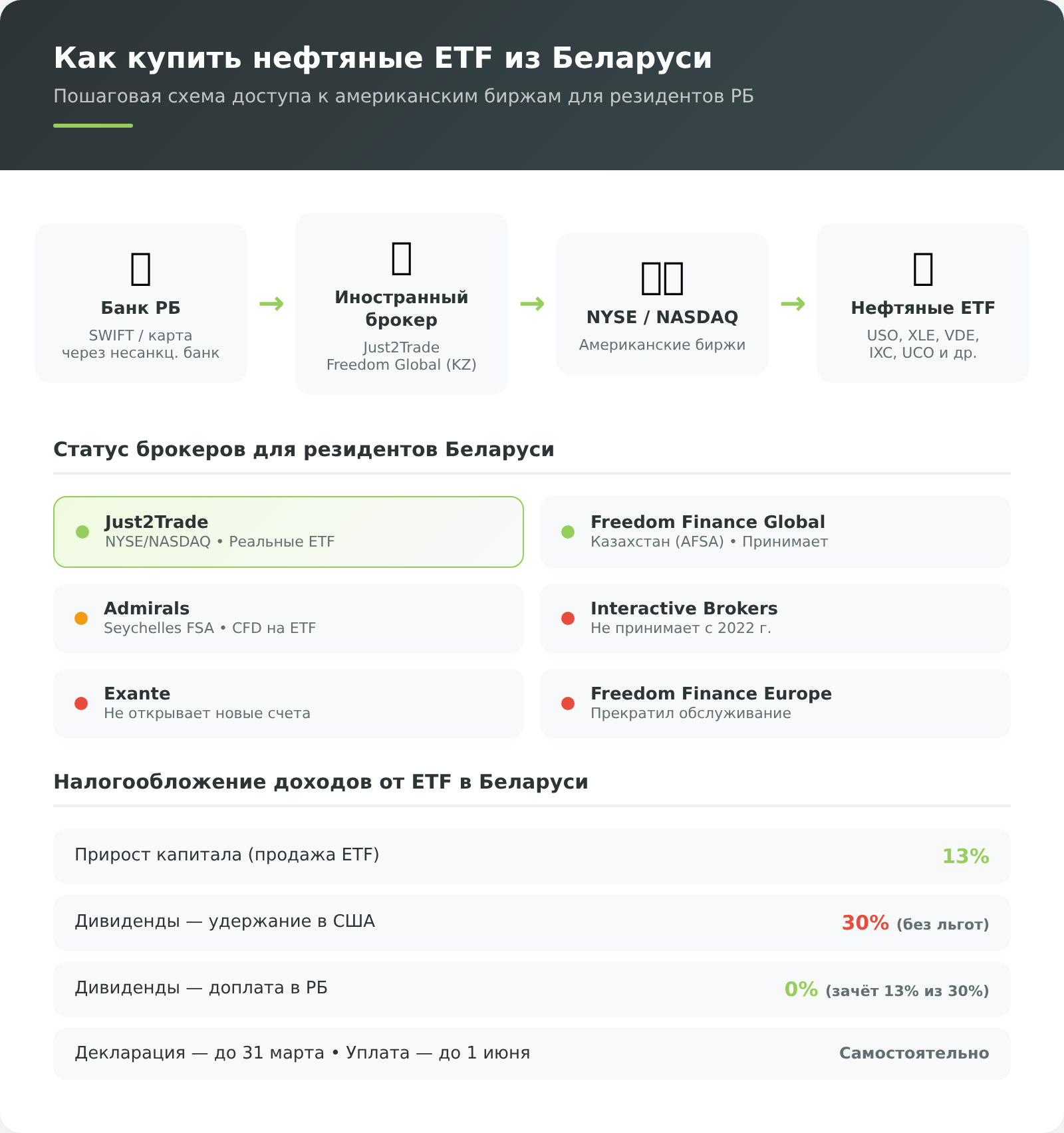 - Just2Trade — международный брокер с доступом к NYSE, NASDAQ и другим площадкам. Принимает резидентов Беларуси, предоставляет торговлю реальными ETF. Подробнее — в нашем обзоре Just2Trade.