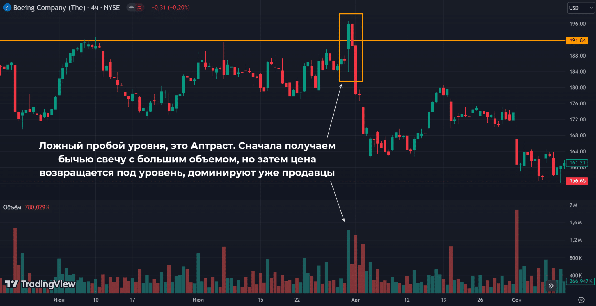 - Shakeout/Upthrust. Упрощенно эти паттерны можно рассматривать как как ловушки для трейдеров. В рамках шейкаутов и аптрастов собираются стопы толпы и только после этого начинается истинное движение. Аптраст выглядит как попытка обновить максимум, но свеча закрывается на минимуме. Незадолго до этого должен быть бычий бар с большим диапазоном и объемом, следующая свеча не подтверждает бычий настрой рынка.