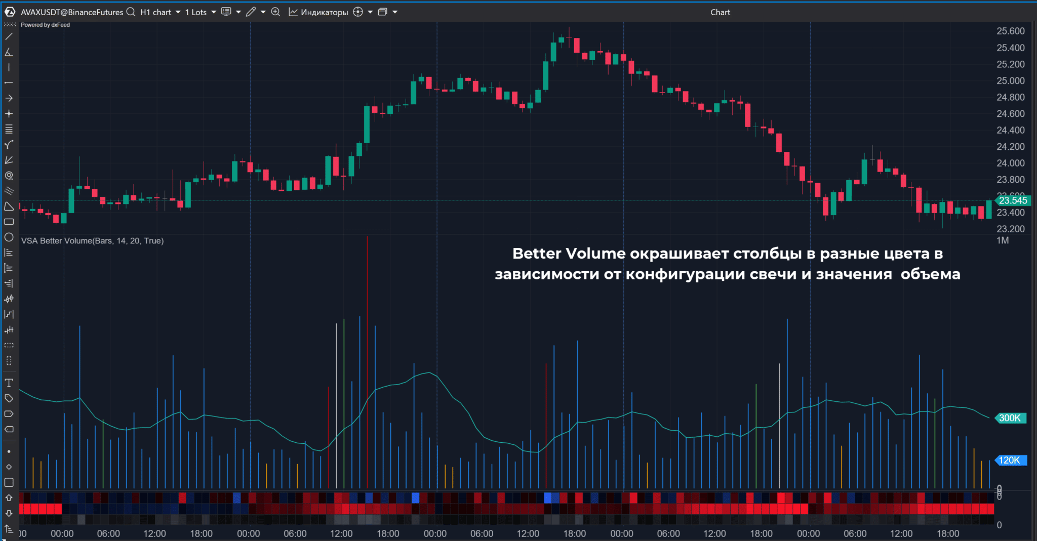 - Better Volume. Продвинутая версия обычного индикатора вертикальных объемов, столбцы окрашиваются в разные цвета в зависимости от конфигурации свечи и объема. Облегчает работу по VSA.