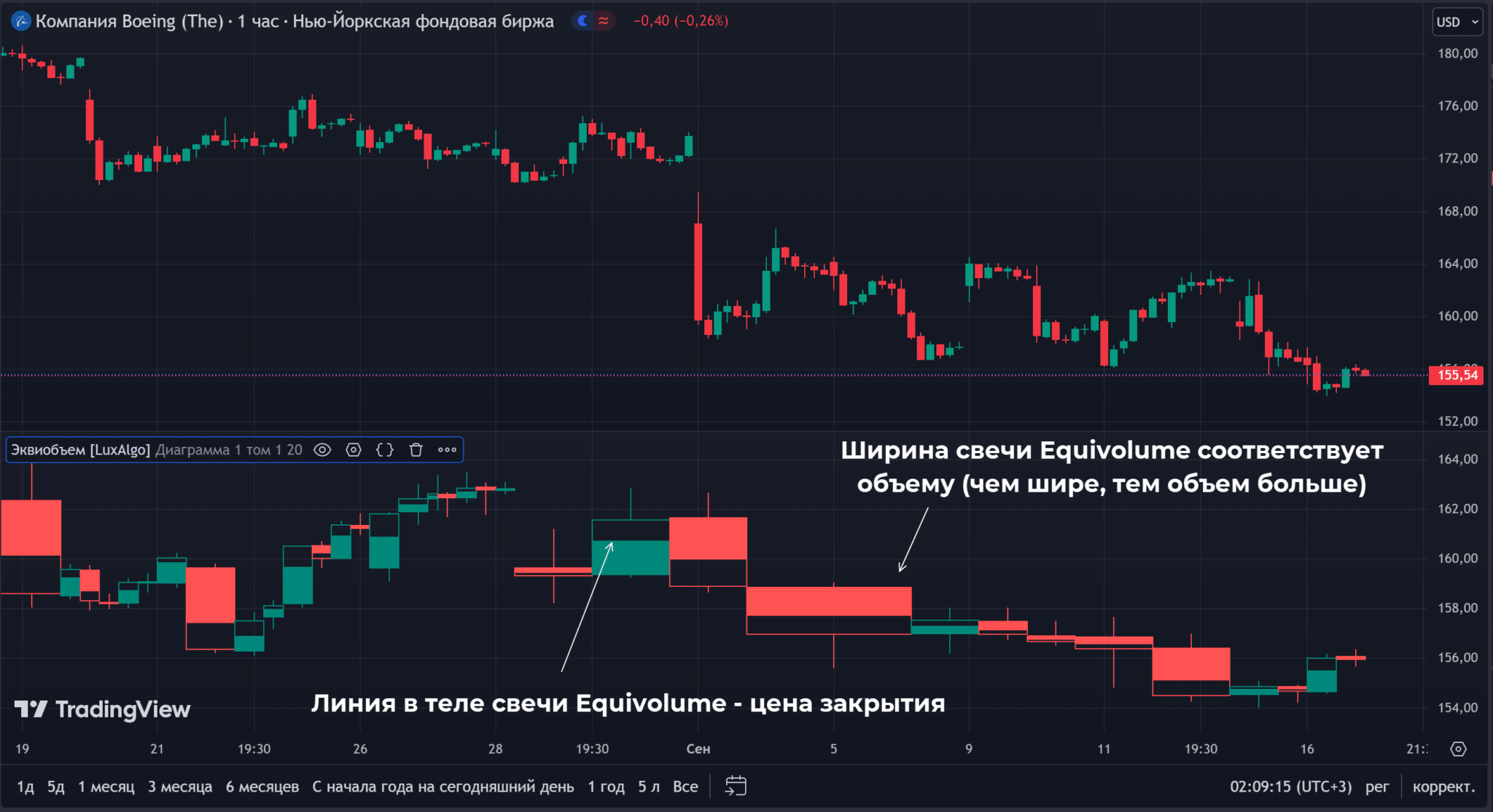 Нестандартный способ предоставления информации о проторгованных контрактах. Вместо обычной гистограмма Equivolume выглядит как свечной график, причем ширина каждой свечи напрямую зависит от объема. Чем он больше, тем шире свеча.