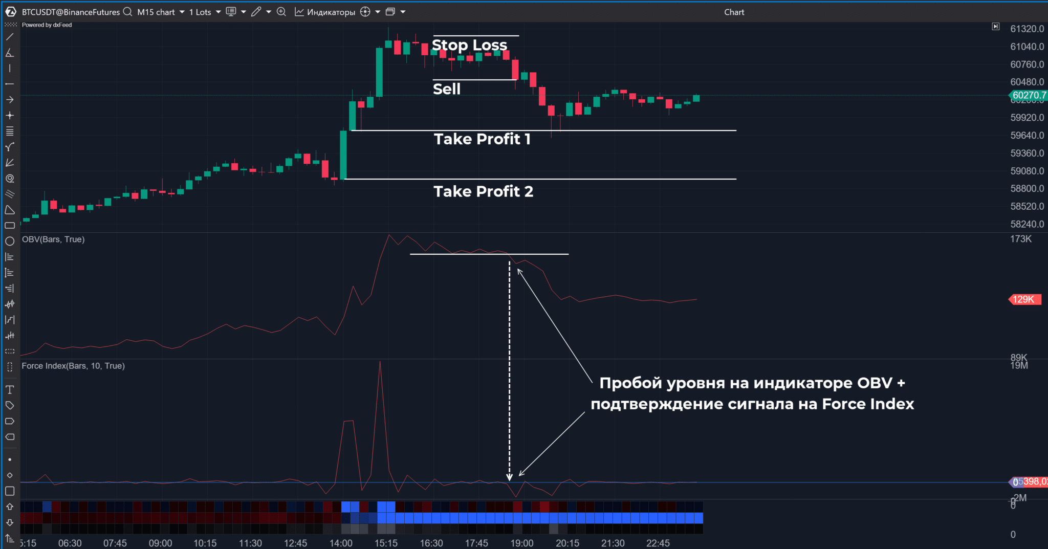 Пробойная ТС, но нас интересуют уровни не на графике, а на индикаторе OBV. On Balance Volume использует объемы, поэтому стратегию можно записать в «объемные».