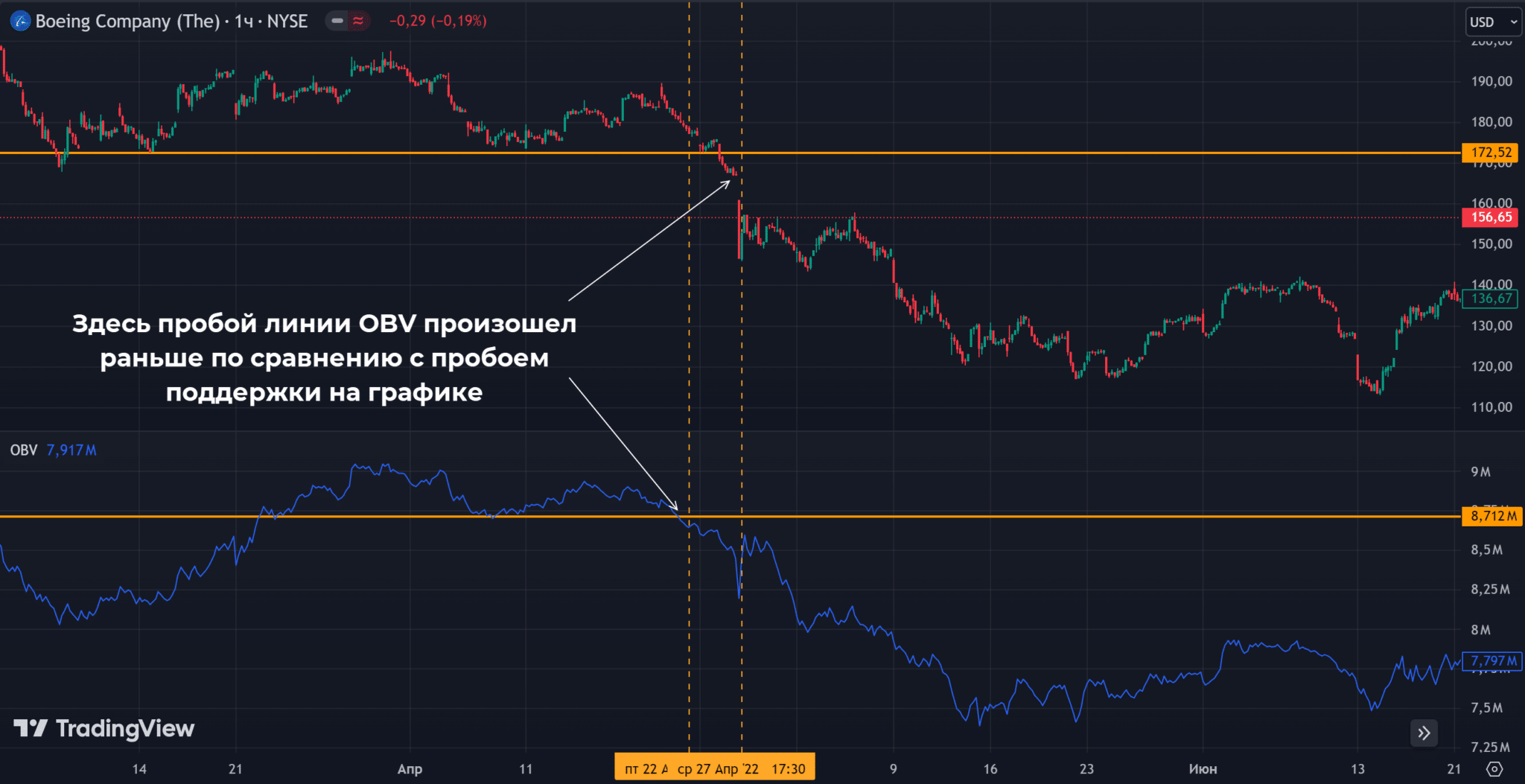 - Графические построения на OBV. Нас интересуют пробои уровней поддержки/сопротивления, трендовых линий. Иногда пробой в окне индикатора предвосхищает пробой на графике.