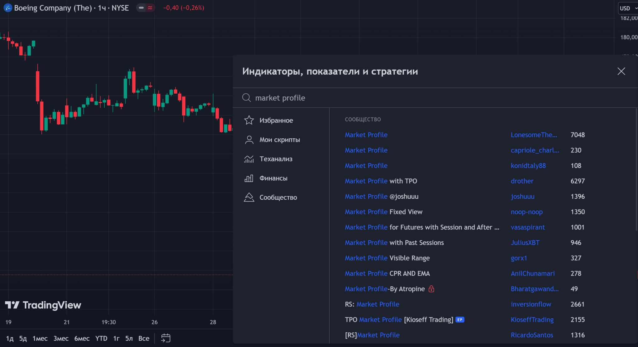 - Market Profile. Еще одно название группы индикаторов, так, в TradingView по этому запросу выдается пара десятков индикаторов. Все они строят гистограмму горизонтальных объемов.