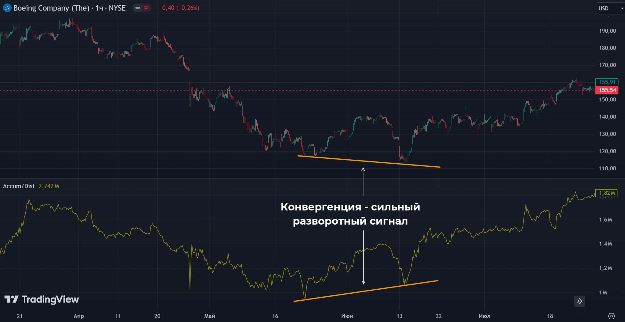 - Accumulation/Distribution (Накопление/Распределение). Если не вдаваться в детали, то индикатор оценивает, где закрывается свеча относительно определенного диапазона. Если цена закрытия у верхней границы, то идет накопление и более вероятен рост, у нижней – в приоритете нисходящее движение. В анализе используется и оценка направления линии индикатора, и дивергенции/конвергенции.