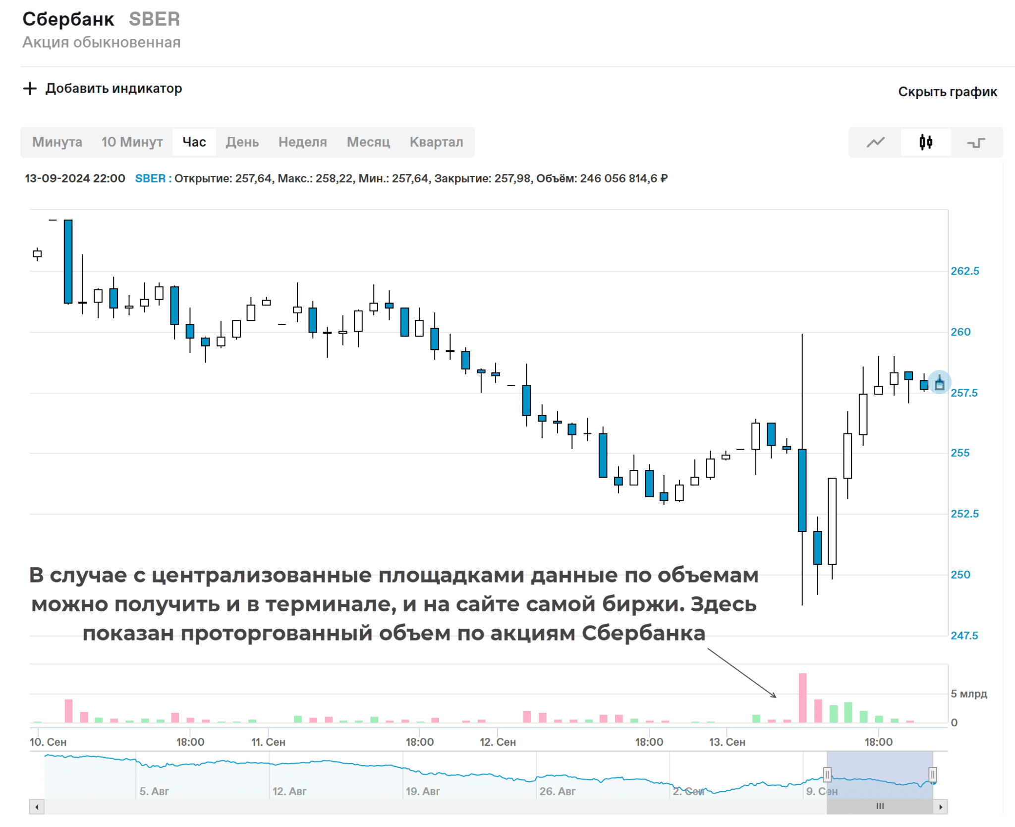 - На централизованных рынках объем – реальное количество купленного актива. Например, на Московской бирже можно получить информацию о проторгованном объеме по акциям Сбербанка.