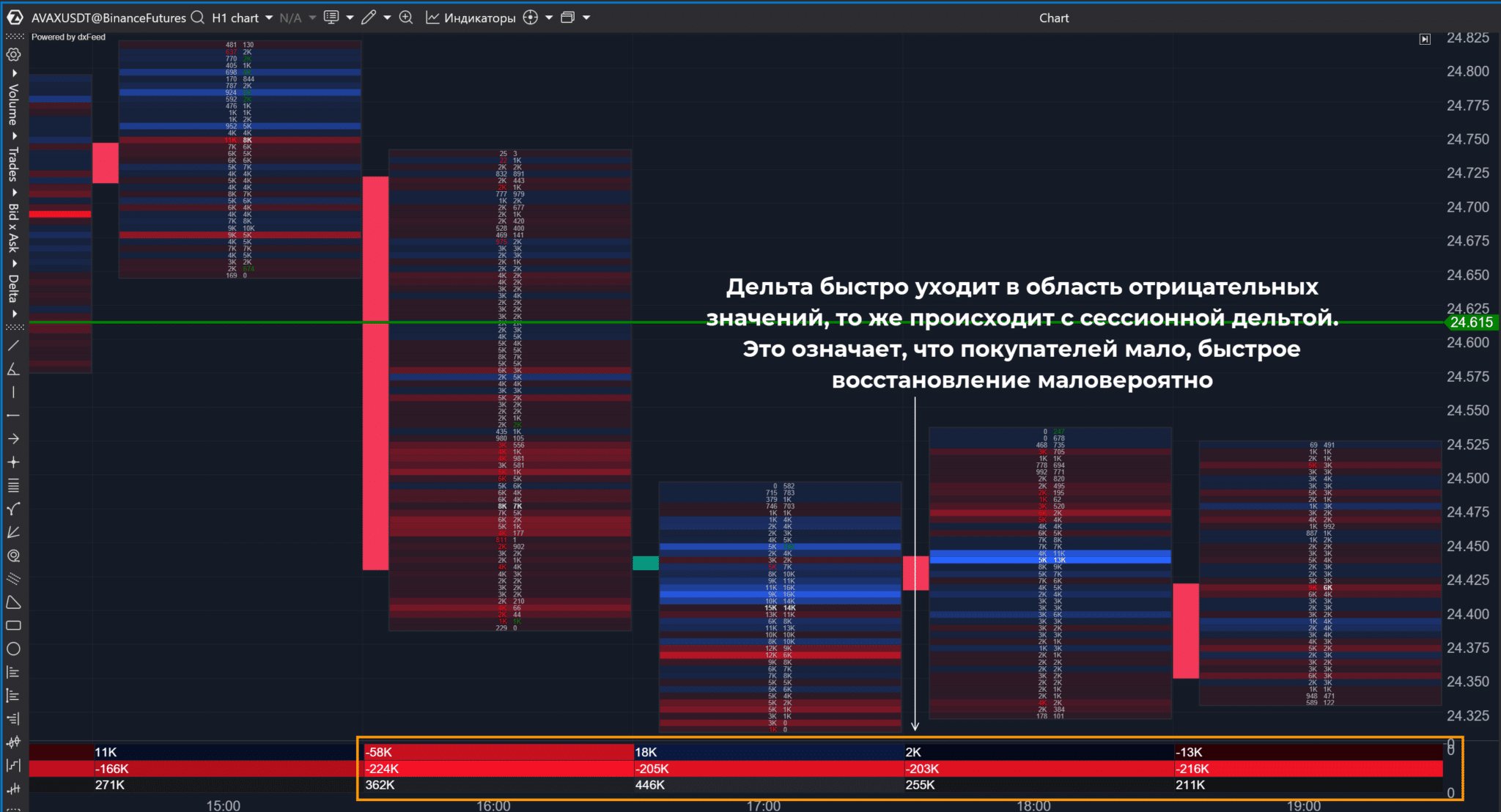 Но дельта и сессионная дельта показывают, что покупатели теряют силы. После небольшого роста оба показателя продолжают снижаться. Это означает, что покупателей мало и их сил недостаточно для отмены недавнего пробоя поддержки.