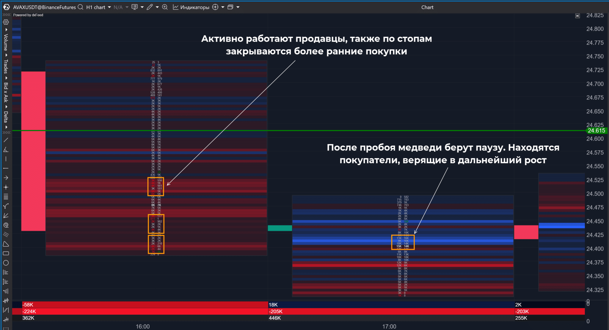 Кластерный анализ показывает, что при пробое был сильный дисбаланс в сторону продаж. Отчасти это обеспечено сработавшими стопами покупателей, ранее открывавших длинные позиции.
