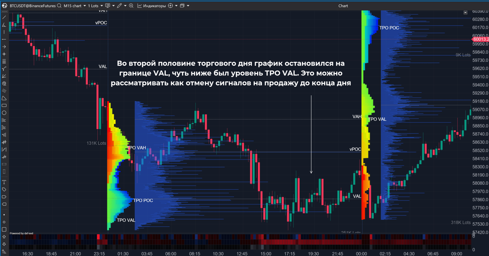 В случае с профилем рынка торговля сводится к поиску уровней и выделению диапазона, на который пришлось 70% проторгованных контрактов или в котором цена находилась 70% времени. Далее подключаются другие фильтры для оценки истинности пробоя или отбойного сигнала.