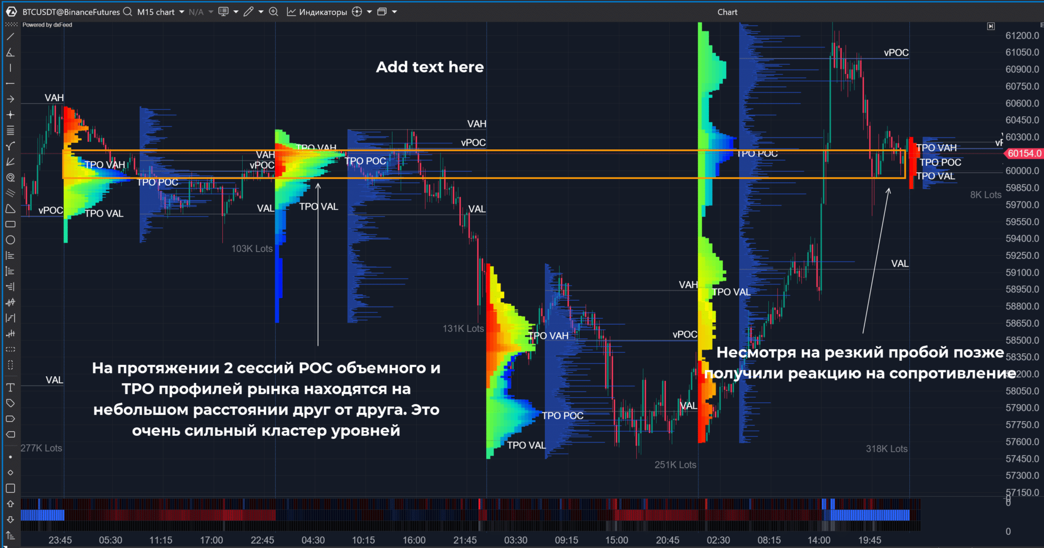 - Уделяйте особое внимание ситуациям, когда РОС с разных профилей рынка практически совпадают. Это сильный кластер уровней, на него практически всегда есть реакция. Даже если кажется, что такое сопротивление/поддержка пробита без проблем скорее всего пробойное движение скоро закончится и начнется откат с ретестом уровней.