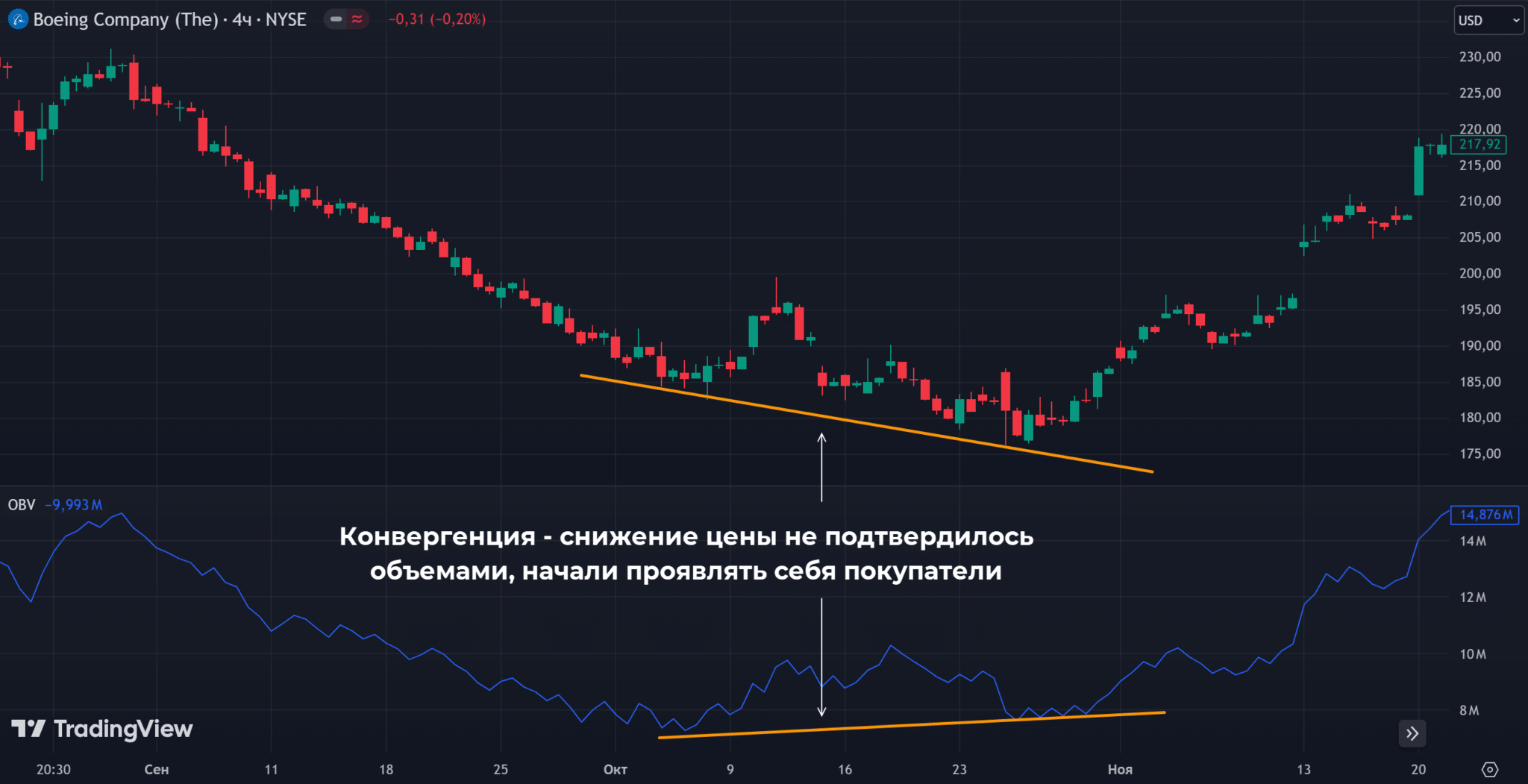 - Дивергенции/конвергенции. Это логичный вывод из предыдущего пункта. Если график растет, а OBV снижается, то рост не обеспечен крупными трейдерами. Вероятнее всего рост как минимум остановится, может начаться коррекция или произойдет полноценный разворот.