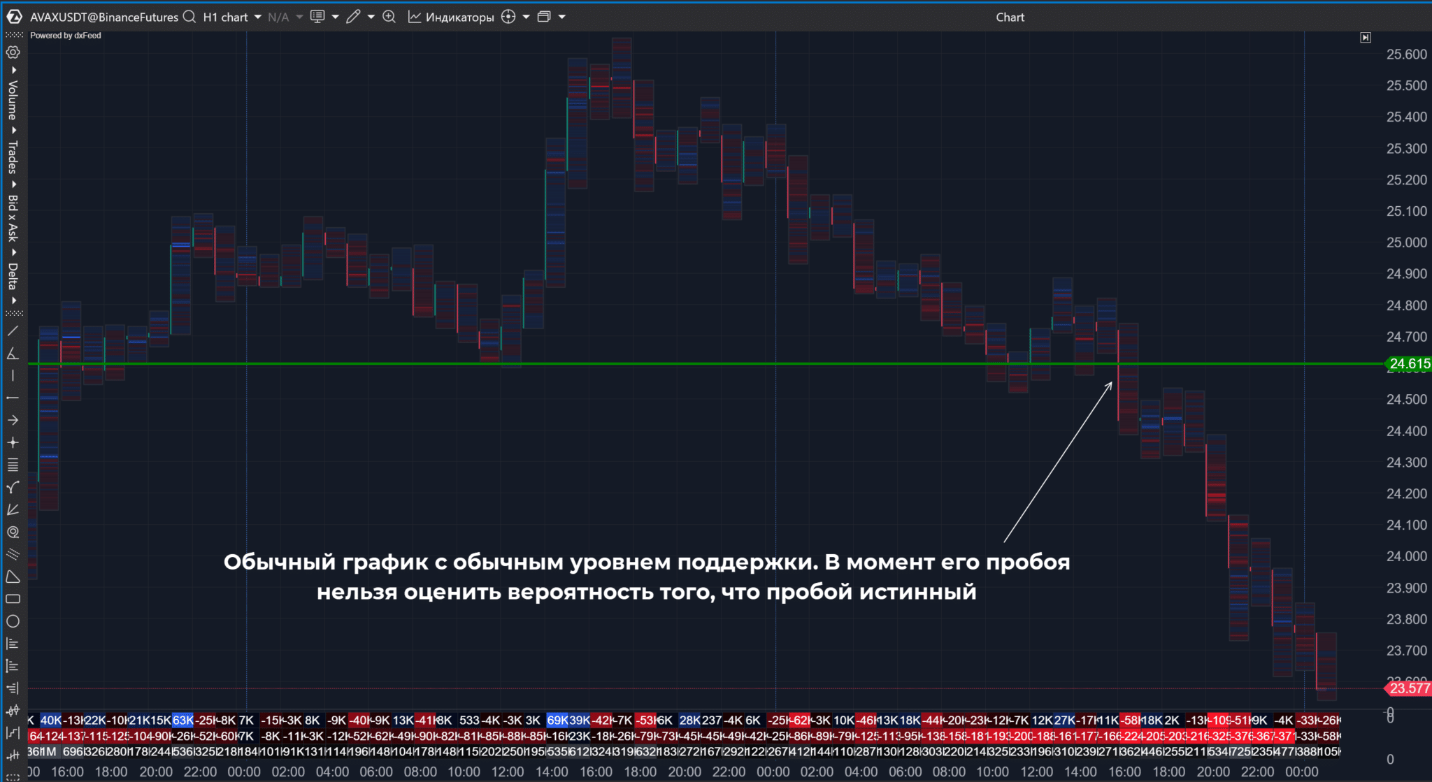 - Оценить вероятность продолжения движения после пробоя поддержки или сопротивления. Например, после пробоя поддержки резко растет активность продавцов, а покупателей мало – скорее всего пробой истинный.