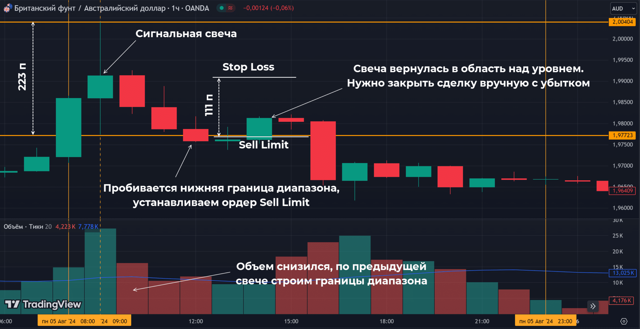 - В момент, когда объем снижается по High и Low предыдущей (сигнальной) свечи строятся горизонтальные линии.