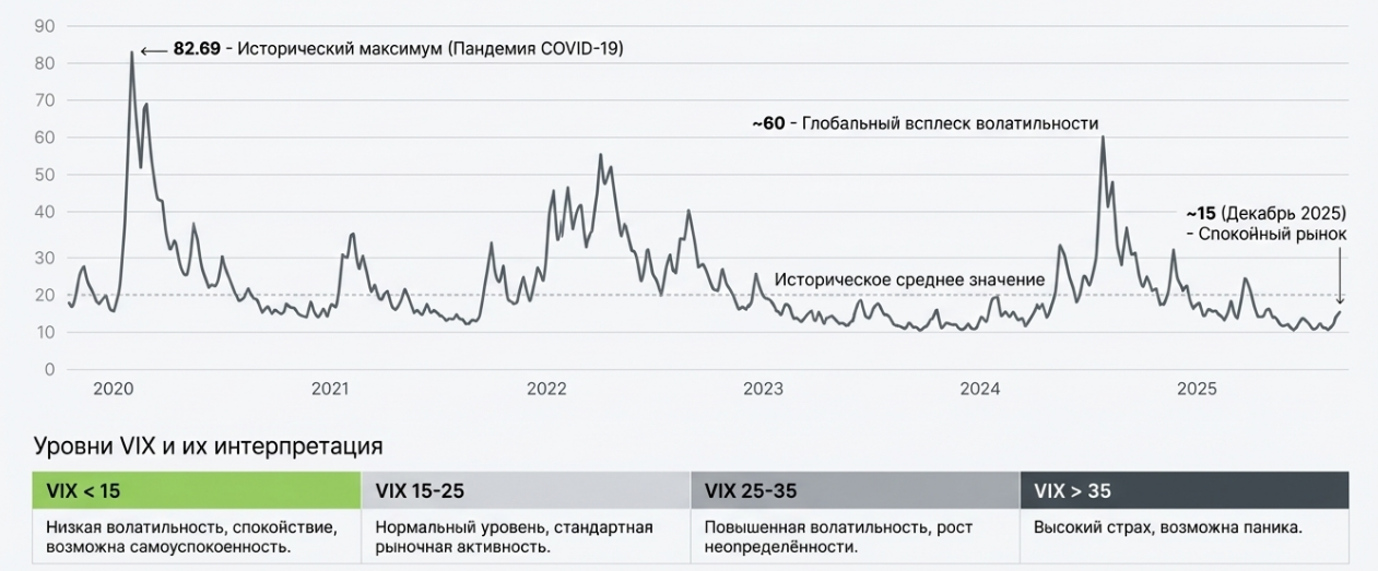Когда речь заходит о волатильности, невозможно не упомянуть VIX — так называемый «индекс страха», который рассчитывается Чикагской биржей опционов с 1993 года. VIX показывает ожидаемую волатильность индекса S&P 500 на ближайшие 30 дней на основе цен опционов.