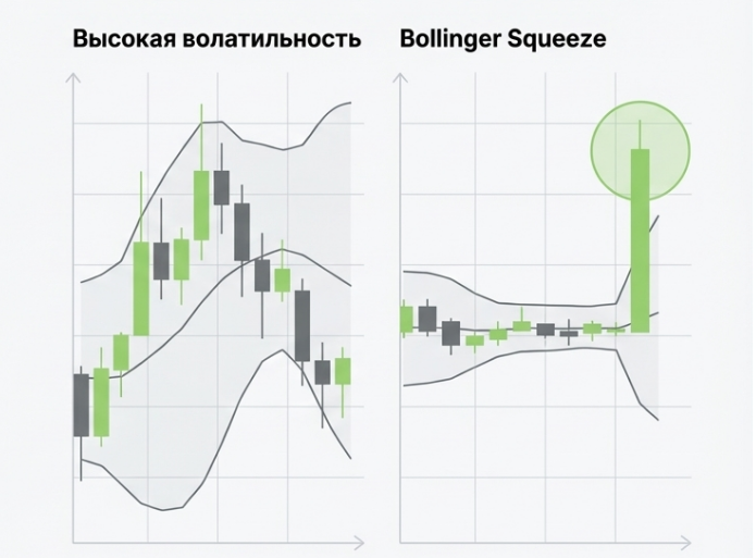 Стратегия Bollinger Squeeze основана на цикличности волатильности: периоды низкой волатильности сменяются периодами высокой, и наоборот. Когда полосы Боллинджера сжимаются до необычно узкого диапазона — это сигнал к подготовке. Сжатие говорит о том, что рынок «набирает энергию» для мощного движения, как сжатая пружина.