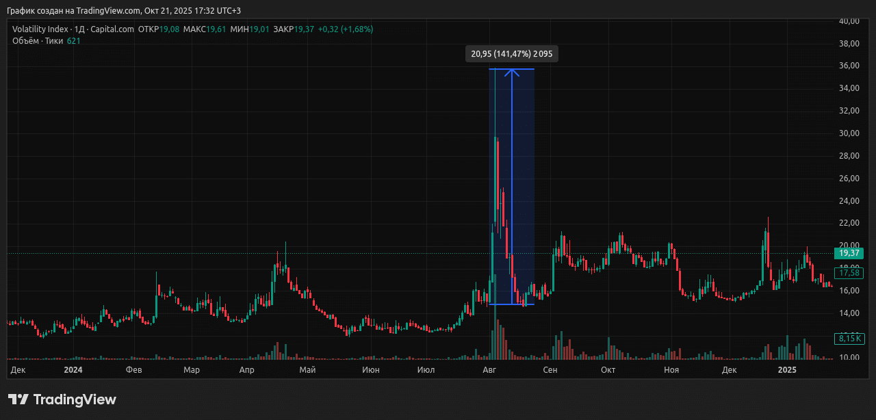 ПримерВ августе 2024 года на фоне глобальных экономических опасений и распродаж VIX подскочил примерно на 141% (с 14 до 35 пунктов в пике), а S&P 500 потерял около 6-8% за первые дни месяца, хотя позже восстановился. Аналогичный сценарий развернулся в апреле 2025 года из-за тарифных угроз: VIX вырос более чем на 90% (до 36 пунктов).