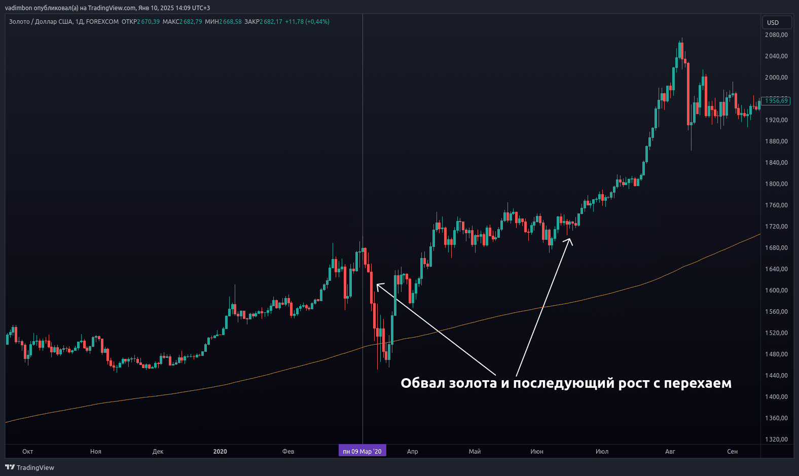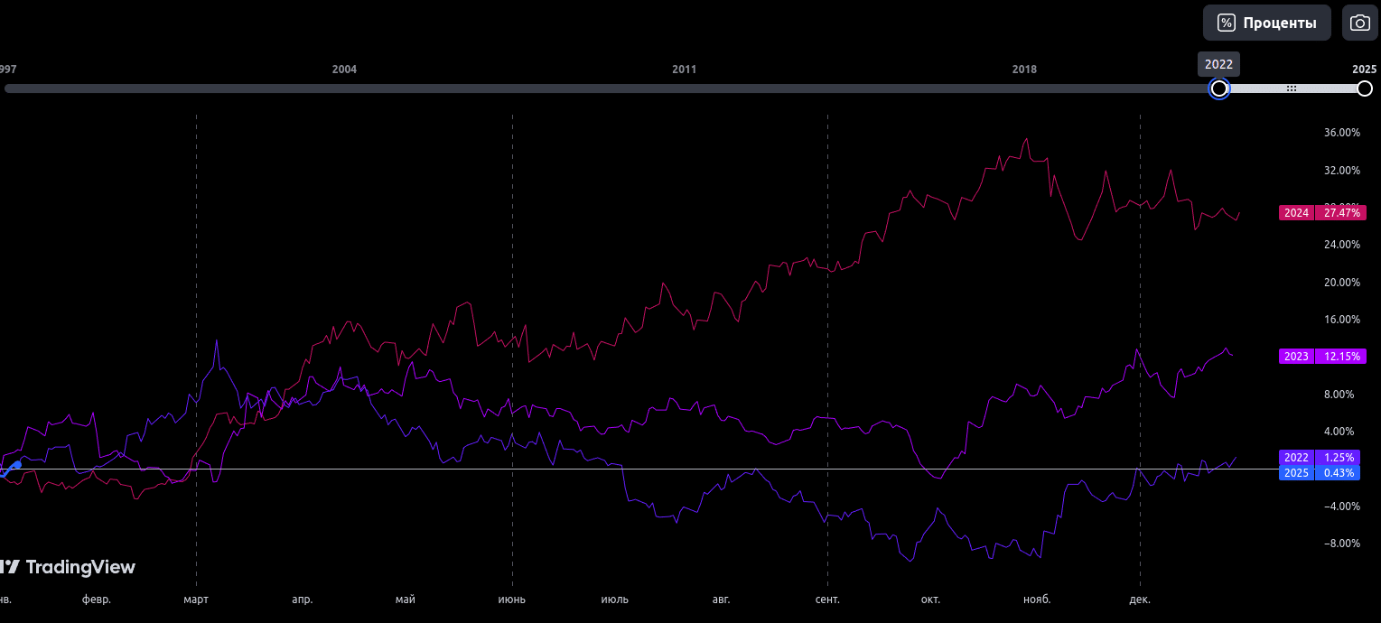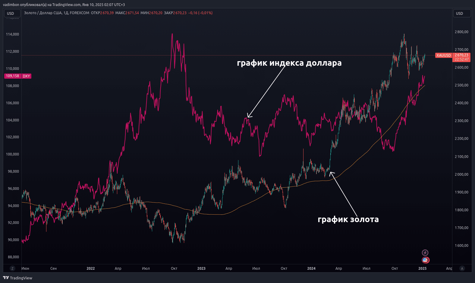 Золото имеет ярко выраженную отрицательную корреляцию с фондовыми индексами, особенно американскими. Когда на рынках паника — инвесторы бегут в защитные активы, прежде всего в золото. И наоборот: при стабильном росте индексов интерес к золоту падает.