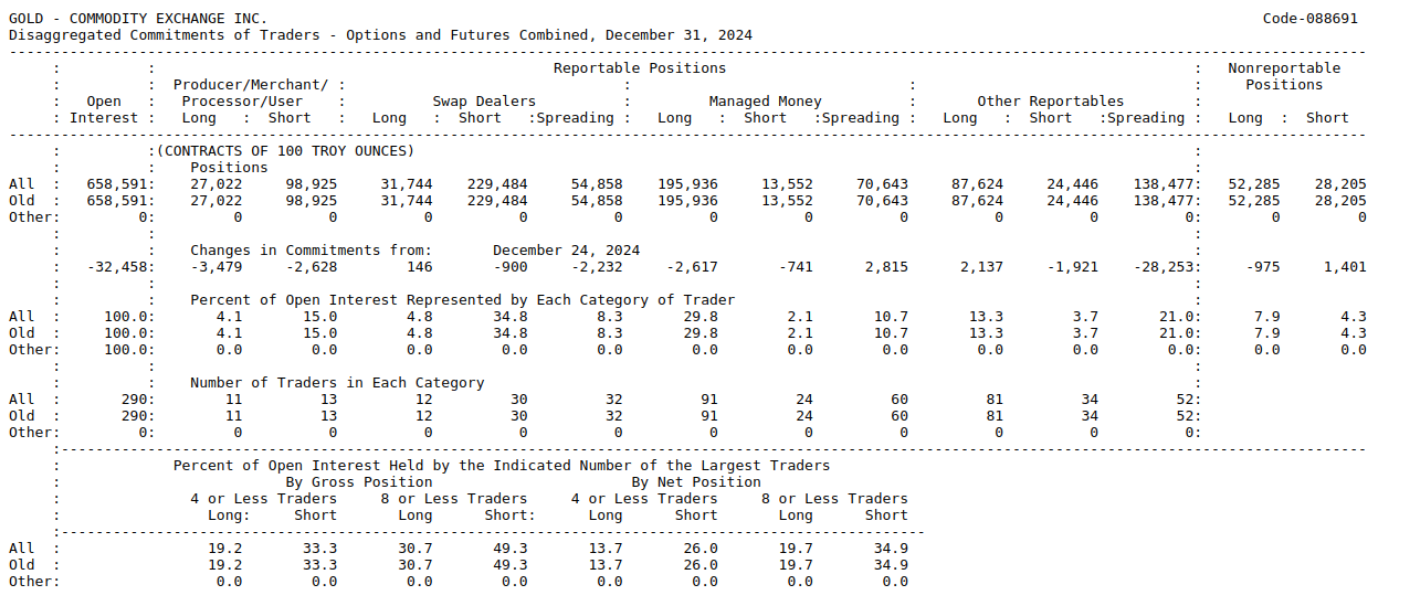 COT показывает недельные изменения в позициях по фьючерсам и опционам на золото для различных категорий трейдеров: